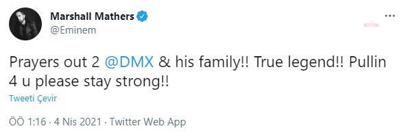 Dünyaca ünlü rap sanatçısı DMX, kalp krizi nedeniyle 2 Nisan'da hastaneye kaldırılmıştı. Sanatçının ailesi ve arkadaşları DMX’in durumunun ağır olduğunu ve yoğun bakımda tutulduğu belirterek sosyal medya hesaplarından çok sayıda iyi dilek mesajlarını paylaşmışlardı. Sanatçı, dün gece tedavi gördüğü hastanede yaşamını yitirdi. DMX’in ölümünün duyurulmasının ardından sevenleri ve arkadaşları, sosyal medya platformları üzerinden çok sayıda mesaj paylaştı.