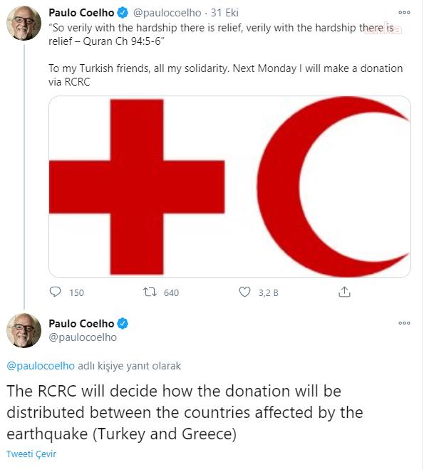 Coelho, İzmir depremine ilişkin sosyal medya hesabı üzerinden paylaşım yaptı. Coelho, Kuran'dan "Elbette zorluğun yanında bir kolaylık vardır. Gerçekten, zorlukla beraber bir kolaylık daha vardır" ayetine yer vererek şu mesajı paylaştı: