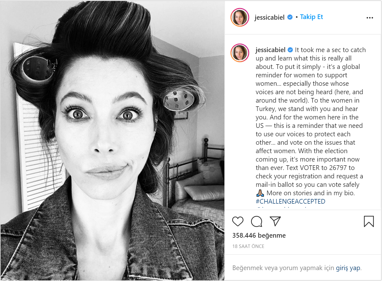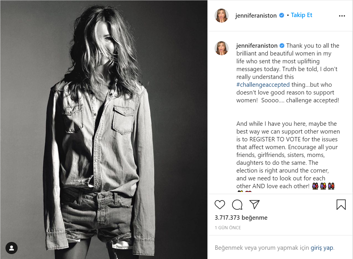 “Gerçeği söylemek gerekirse, #challengeaccepted’ı gerçekten anlamadım. Ama kadınları desteklemek için iyi bir neden göremeyenler! Meydan okuma kabul edilmiştir! Belki diğer kadınları desteklemenin en iyi yolu, kadınları ilgilendiren kampanyalara katılmak. Tüm arkadaşlarınızı, kız arkadaşlarınızı, kız kardeşlerinizi, annelerinizi, kızlarınızı aynı şeyi yapmak için cesaretlendirin.”