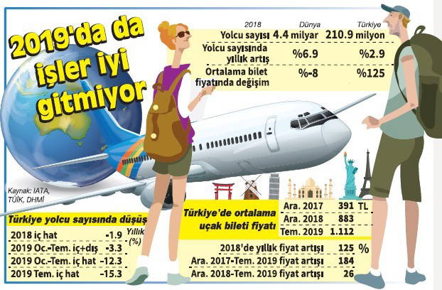 Dünyada uçakla seyahat edenlerin sayısı artarken ve uçak bileti fiyatları düşerken, Türkiye’de tam tersi bir dönem yaşanıyor. Uluslar-arası Havayolu Taşıyıcıları Birliği (IATA) verilerine göre, 2018’de havayoluyla seyahat eden yolcu sayısı bir önceki yıla göre yüzde 6.9 artarak 4 milyar 378 milyon oldu. Ortalama uçak bileti fiyatı ise yüzde 8 düşüşle 345 dolardan 327 dolara indi. 2019’da yolcu sayısında yüzde 4.6’lık artış, fiyatlarda ise yüzde 3’lük düşüş öngörülüyor.