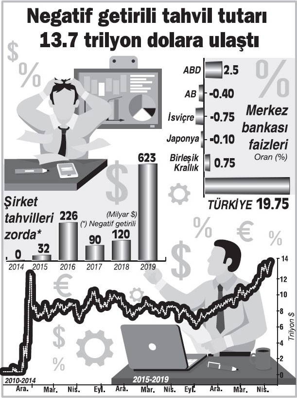 Türkiye yüksek enflasyon ve faizden dert yanarken, Avrupa, ABD ve Japonya merkez bankaları enflasyonun artmamasından ve faizi yükseltememekten şikâyetçi. Bunun sonucu olarak dünyada negatif getirili (eksi getiri) tahvillerin toplam piyasa değeri 13.7 trilyon dolarla rekor seviyelere yükselmiş durumda.