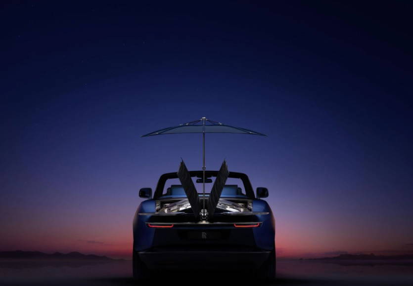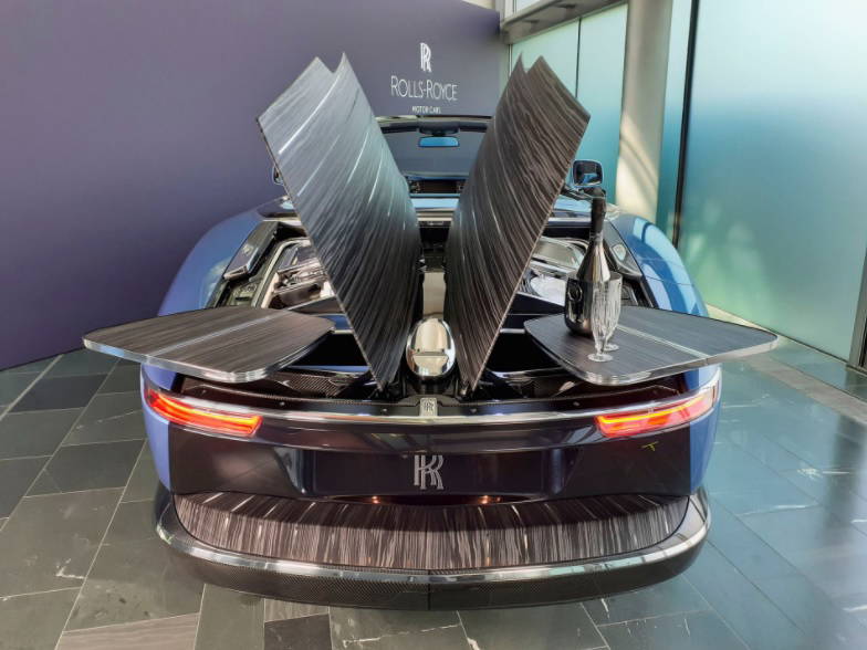 Rolls-Royce Boat Tail'ın arka tarafında bir sofra takımı, içecekler için buzdolabı, döner kokteyl masaları, açılır sandalyeler ve güneş şemsiyesi bulunuyor. Arka kapaklar açıldığında bir kanat formu oluşuyor.