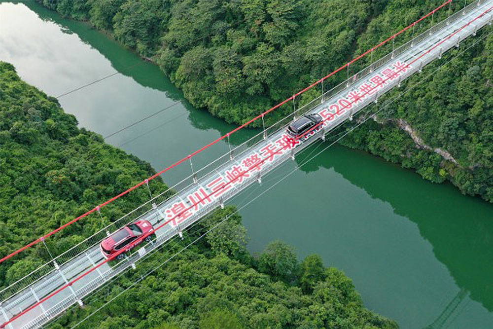 Çin topraklarındaki 2 bin 300’den fazla cam köprü bulunuyor. Açılanların en sonuncu köprü ise ise devasa boyutlarıyla dikkat çekti. Lianzhou eyaletindeki aynı adlı nehrin üzerine kurulan cam köprü 526.14 metrelik uzunluğu ile Guiness Rekorlar Kitabı’na girdi. Huangchuan’ın Üç Geçitli Manzara kanyonunda yer alan köprü 4.5 cm kalınlığında ve yüzde 99.15 şeffaf olan lamine camdan yapıldı. Köprünün bir başka özelliği ise üzerinde arabaların dolaşabileceği kadar geniş olması.
