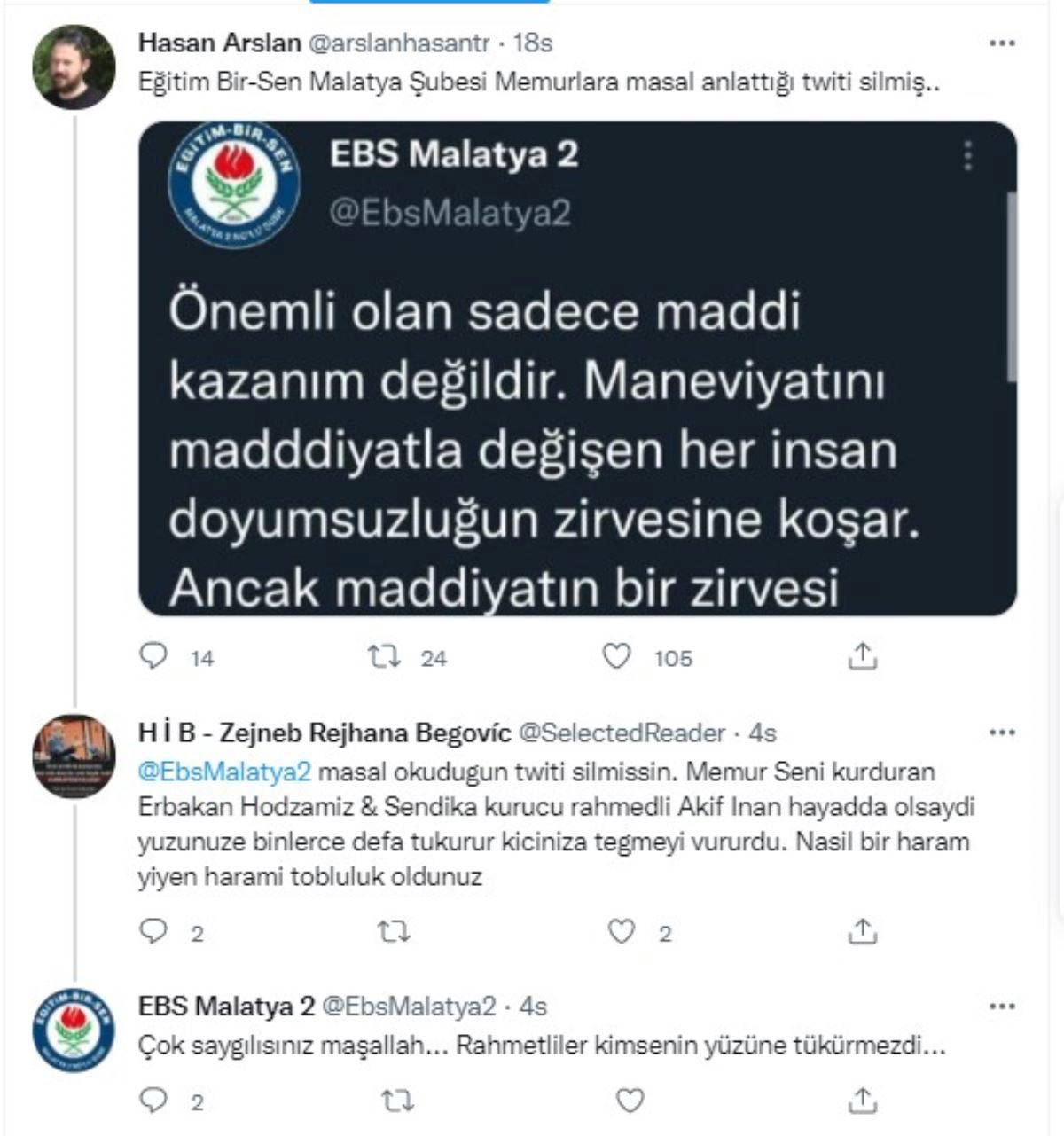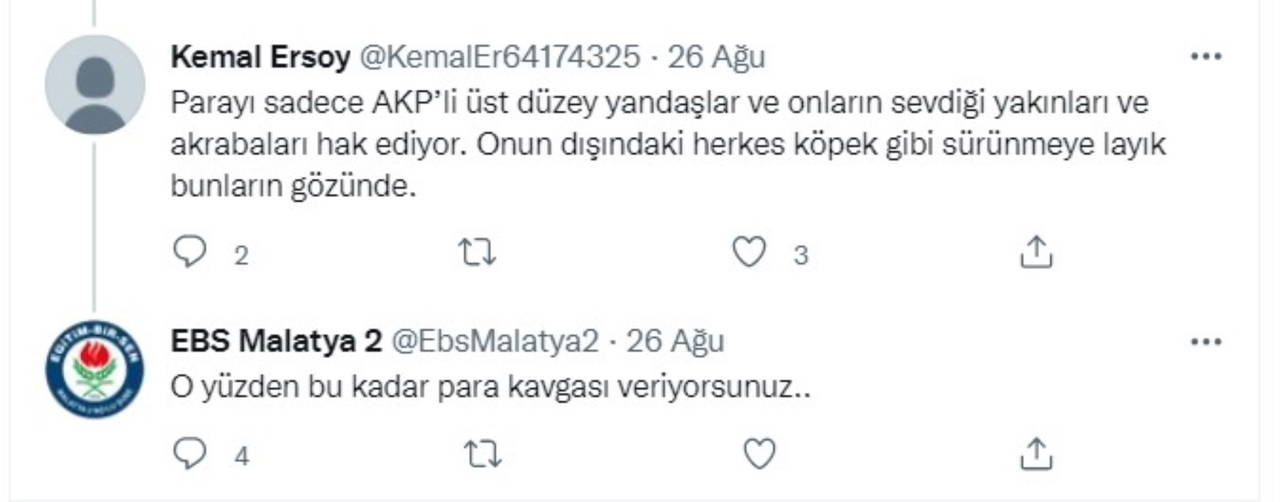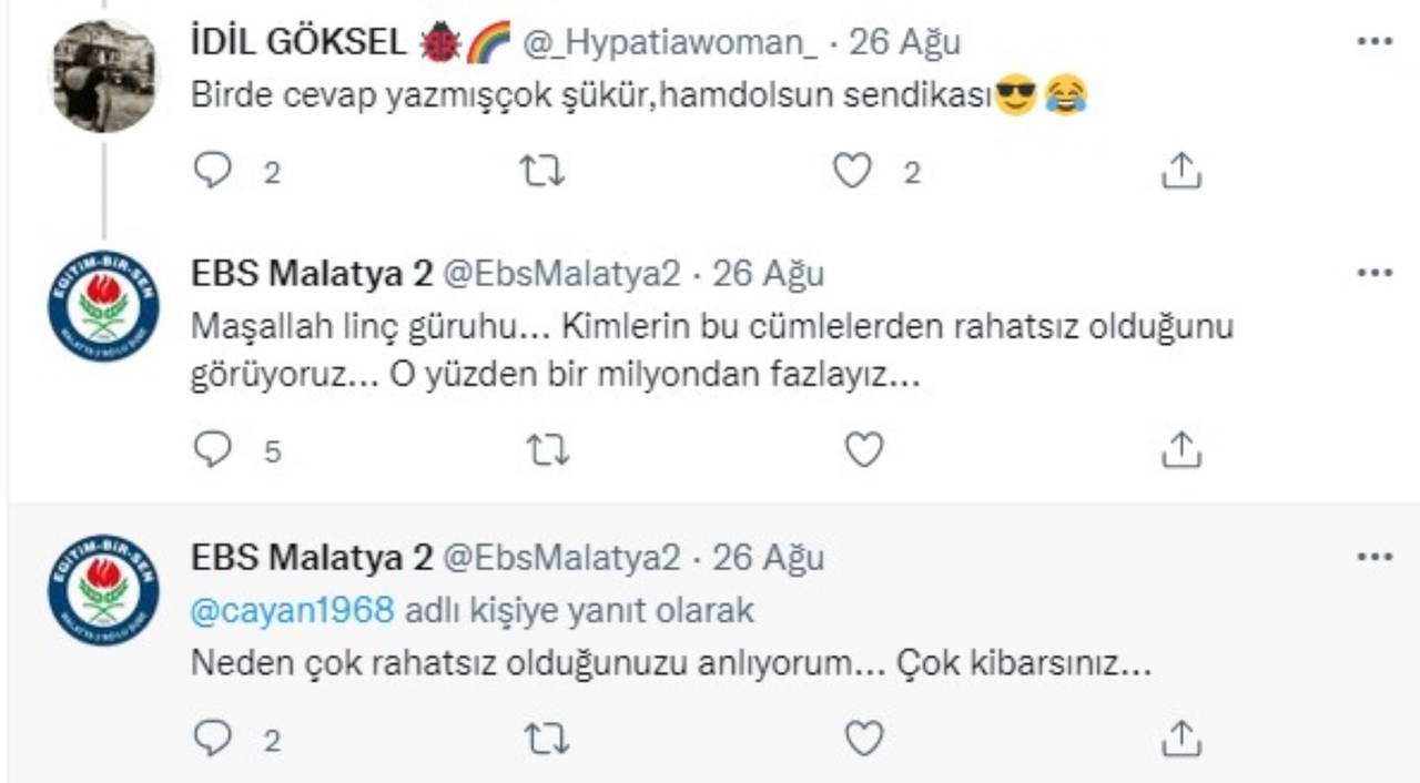 Söz konusu paylaşım kaldırıldı fakat sendikaya ait hesaptan tepki gösteren yurttaşlara yanıt verilmeye deva edildi.