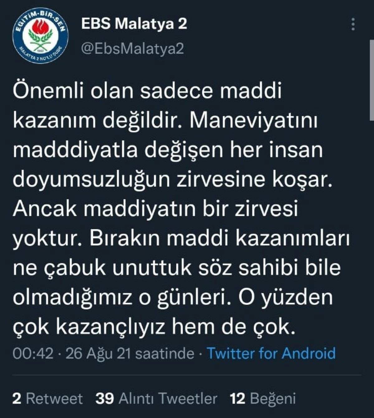 Düşük zamma destek veren Yalçın'ınI Memur-Sen'e bağlı Eğitim Bir-Sen'in Malatya 2 nolu Şubesi'nden ilginç bir destek geldi.