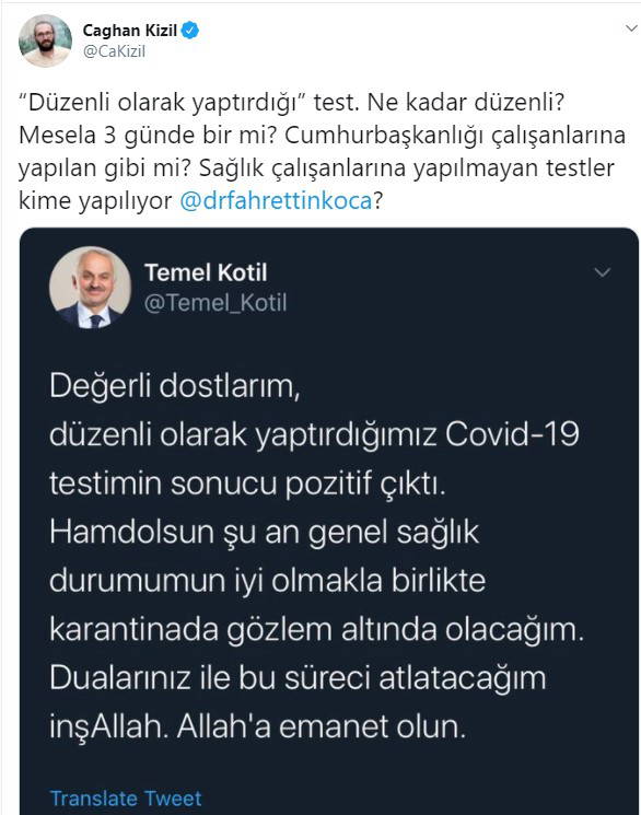 Türk Tabipleri Birliği (TTB) Merkez Konseyi eski başkanı Prof. Dr. Raşit Tükel Kotil'in açıklaması üzerine yaptığı paylaşımda, "Düzenli test yaptıranlar diye ayrı bir zümre oluştu. Testleri pozitif çıktığında kendilerini ifşa ediyorlar. Temaslılara, risk gruplarına test yok oysa ki. Test yapılma kriterlerinde gizli ajanda!" dedi.