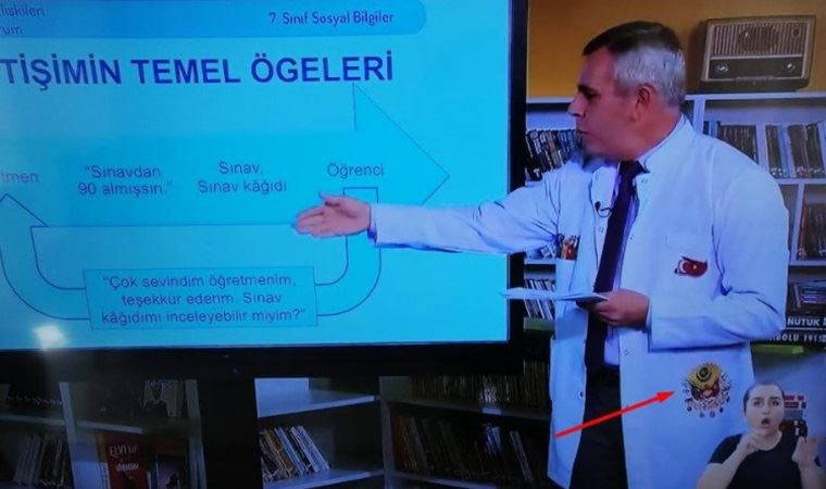 Eğitim Bilişim Ağı (EBA) sistemi üzerinden devam eden okullarda öğretmenler çevrimiçi olarak ders anlatıyor. Devam eden derslerde bir öğretmenin önlüğünde yer alan arma ise tepki çekti.