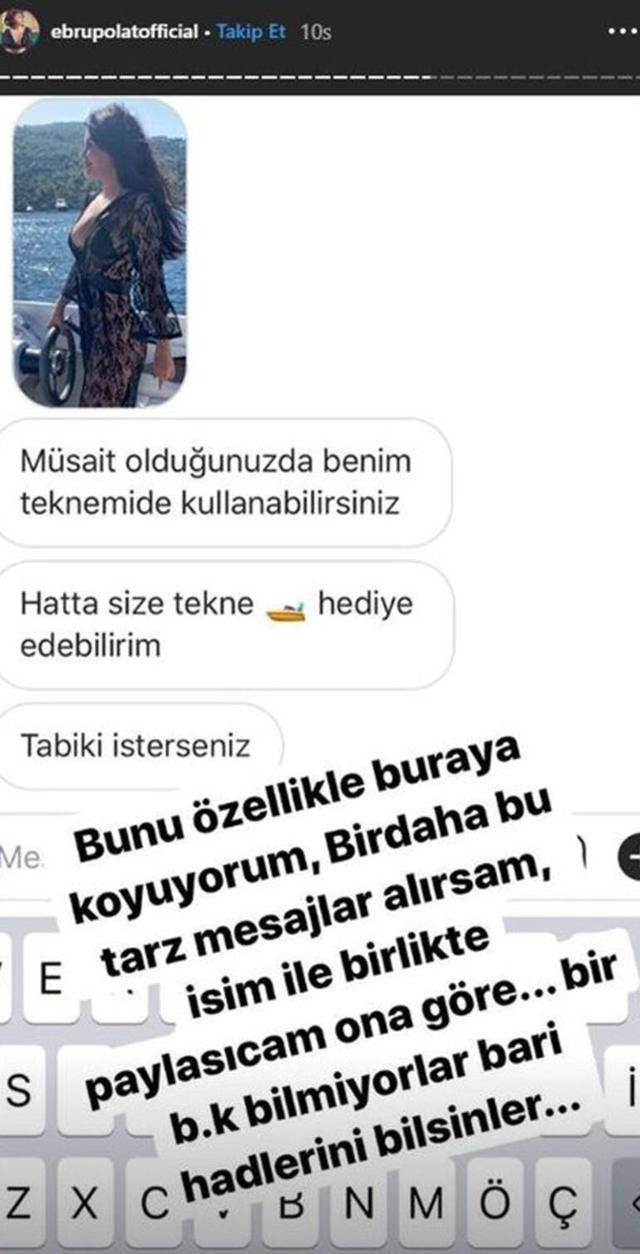 Bu tarz mesajlar gelmeye devam ederse isim de paylaşacağını vurgulayan Ebru Polat'a gelen mesajda, "Benim teknemi de kullanabilirsiniz; hatta size tekne hediye edebilirim" yazıyordu.
