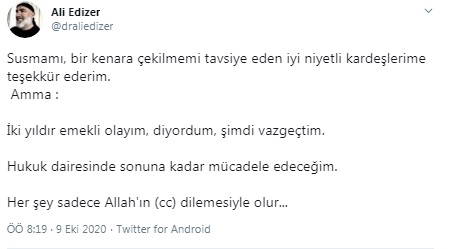 Medeni Hukuk'a karşı mücadele ettiğini söyleyen Edizer, kararın ardından sosyal medya hesabından yaptığı paylaşımda "Susmamı tavsiye eden iyi niyetli kardeşlerime teşekkür ederim" derken, "hukuk dairesinde sonuna kadar mücadele edeceğini" yazdı.