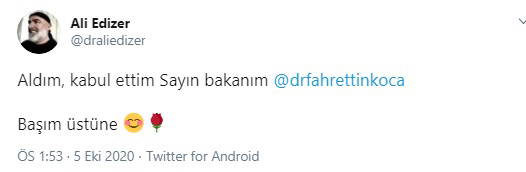 Edizer, kararın ardından Twitter hesabından Sağlık Bakanı Koca'ya seslenip gülme ve çiçek emojisi kullanarak "Aldım, kabul ettim Sayın bakanım Başım üstüne" diye yazdı.
