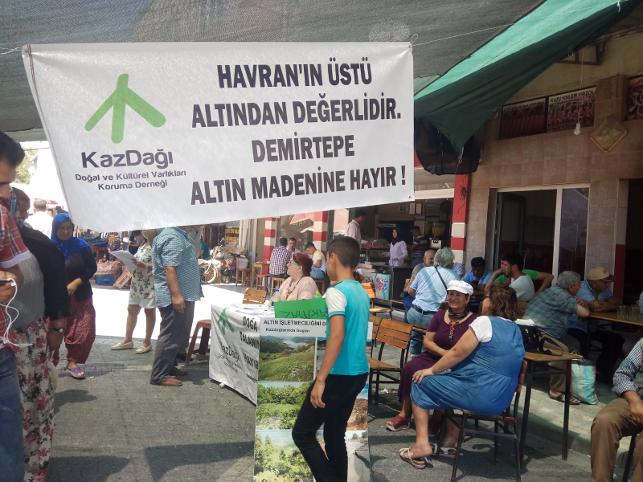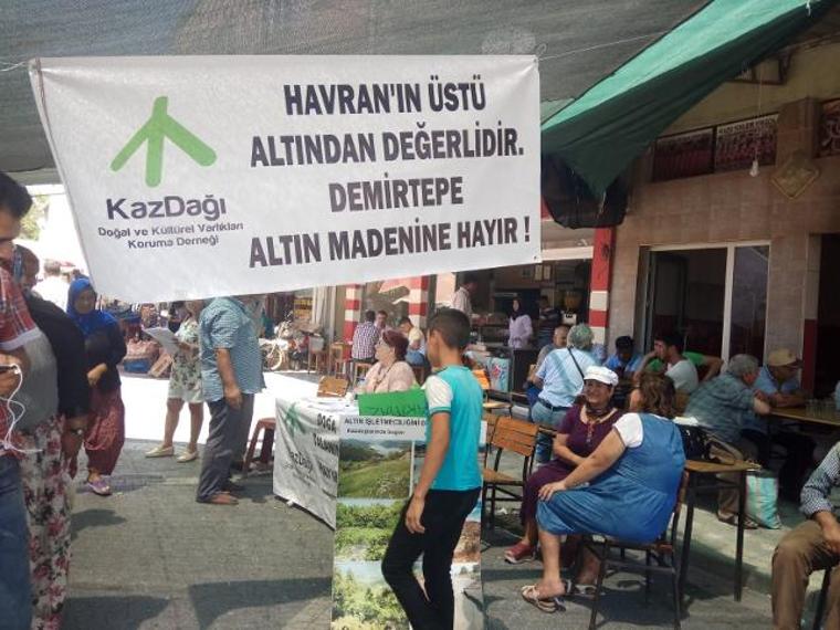 Balıkesir Edremit’te Havran-Büyükşapçı köyünde Bahar Madencilik A.Ş. tarafından yapılmak istenen Demirtepe Altın Madeni Projesi’ne karşı, Kaz Dağı Doğal ve Kültürel Varlıkları Koruma Derneği’nin açtığı davalar sonucu “ÇED (Çevresel Etki Değerlendirmesi) raporu alınması zorunludur” kararı çıkmış, ardından da projeye karşı imza kampanyası başlatılmıştı. Doğu gönüllüleri, bölgede henüz ağaç kesimi olmadığını, ancak süreç diğer madenlerdeki gibi ilerlerse ve engel olunmazsa kesimin başlaması ve siyanürlü altın madeni kurulmasının yakın olacağına ilişkin geçtiğimiz hafta basın açıklaması yapmıştı. Açıklamada 6 Ağustos’ta, Ankara’da, Çevre ve Şehircilik Bakanlığı’nca İDK (İnceleme Değerlendirme Komisyonu) toplantısında ÇED raporunun görüşüleceği belirtilmişti. Dernek gönüllüleri, “Havran’ın Üstü Altından Değerlidir” sloganıyla, Havran’daki birçok yerel örgütle, Havran Ziraat Odası’yla ve partilerin ilçe örgütleriyle görüşmeler yaptı ve imza kampanyasını genişletti.