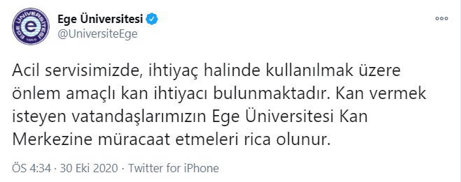 "Acil servisimizde, ihtiyaç halinde kullanılmak üzere önlem amaçlı kan ihtiyacı bulunmaktadır. Kan vermek isteyen vatandaşlarımızın Ege Üniversitesi Kan Merkezine müracaat etmeleri rica olunur."