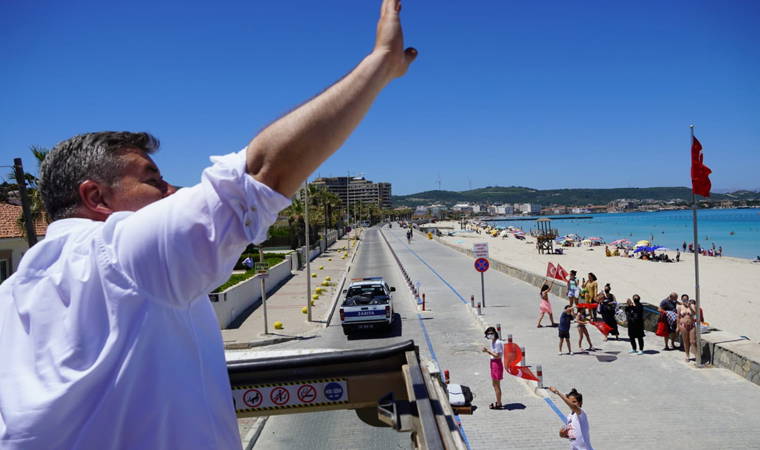 Koronavirüs salgını tedbirleri kapsamında kutlanılan 19 Mayıs Atatürk’ü Anma Gençlik ve Spor Bayramı coşkusu Çeşme’de sokaklara taşındı. İlçedeki meydan ve mahalleler Türk Bayraklarıyla süslenirken dev Atatürk posterleri de asıldı. Çeşme Belediye Başkanı M. Ekrem Oran, korteje açık bir araç üstünde katılarak balkon ve pencerelerdeki vatandaşları selamladı.