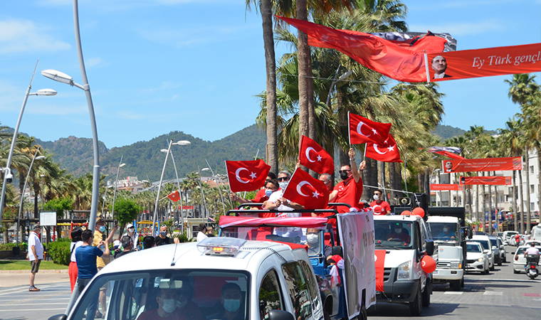 Marmaris’te koronavirüs salgını nedeniyle geniş çaplı kutlamaların yapılmadığı 19 Mayıs Bayramı için özel olarak süslenen ve ses sistemi yüklenen belediye araçları tüm mahalleleri gezerek gençlik şarkıları ve marşlar çaldı. Üstü açık araçla kortejin önünden giden Belediye Başkanı Mehmet Oktay, halkı selamlayarak bayramı kutladı. Kortej boyunca vatandaşlara bayrak ve çocuklara da balon dağıtan ekiplere ilgi çok büyüktü. Evlerinin balkonlarına, camlarına, sokaklara çıkan vatandaşlar ellerindeki bayrakları sallayarak, alkışlarla araçlara eşlik etti.