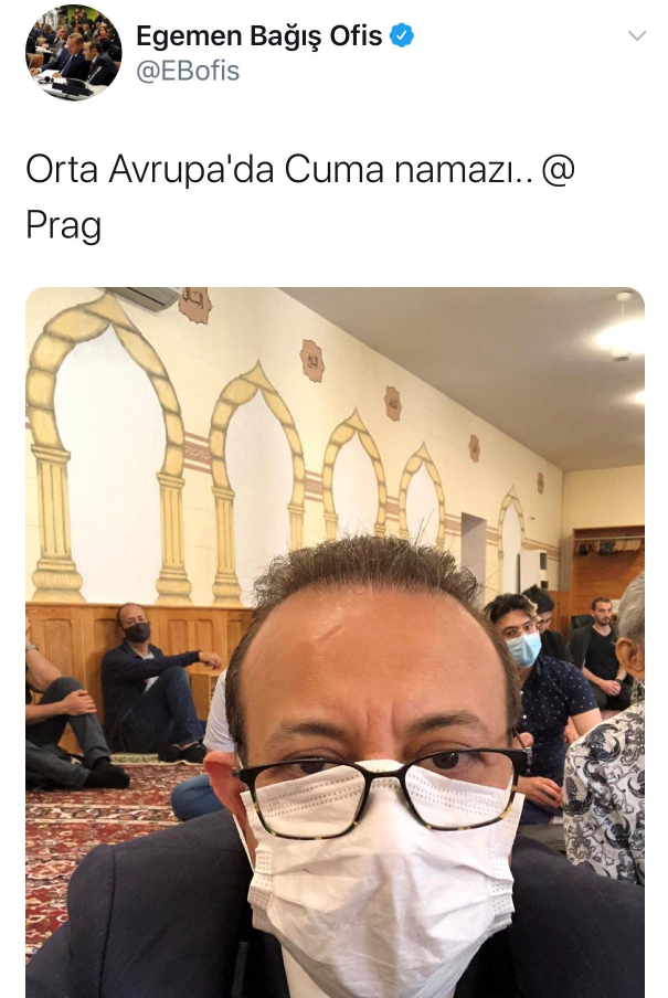 Egemen Bağış Cuma namazını kıldığı fotoğrafını paylaşırken, söz konusu fotoğrafa da "Orta Avrupa'da cuma namazı @Prag" notunu düştü.