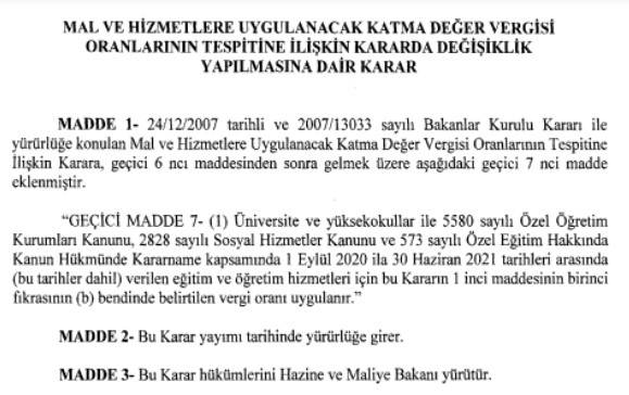 Böylece salgın döneminde genel anlamda özel sektöre verilen desteklerin devamı mahiyetinde üniversiteler de dahil olmak üzere eğitim-öğretim dönemi başlamadan önce bu alanda faaliyette bulunan mükelleflerin KDV oranları indirilerek, aradaki farkın velilere olumlu yansıması amaçlandı.