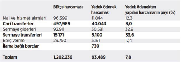 Yedek ödenekten yapılan 93.5 milyar TL’ik harcamadan sermaye giderlerine 30.5 milyar TL gitti.