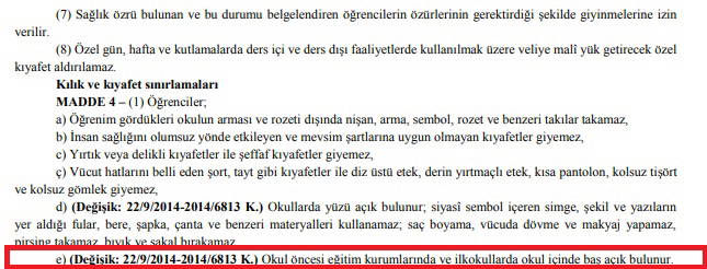 Milli Eğitim Bakanlığı'na bağlı okul öğrencilerinin kılık ve kılık kıyafetlerine dair yönetmelikteki ilgili madde "Okul öncesi eğitim kurumlarında ve ilkokullarda okul içinde baş açık bulunur." ifadesiyle yer alıyor.