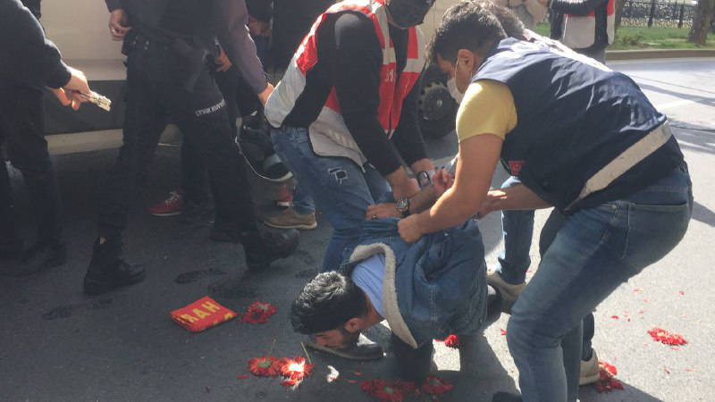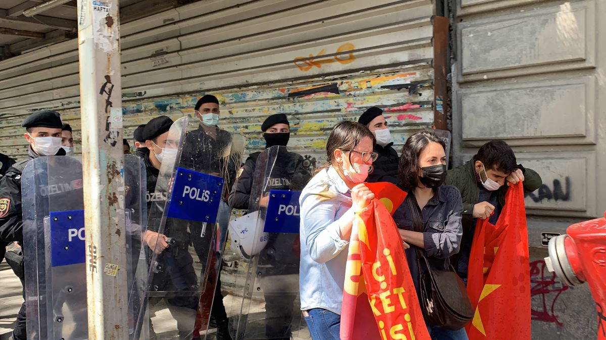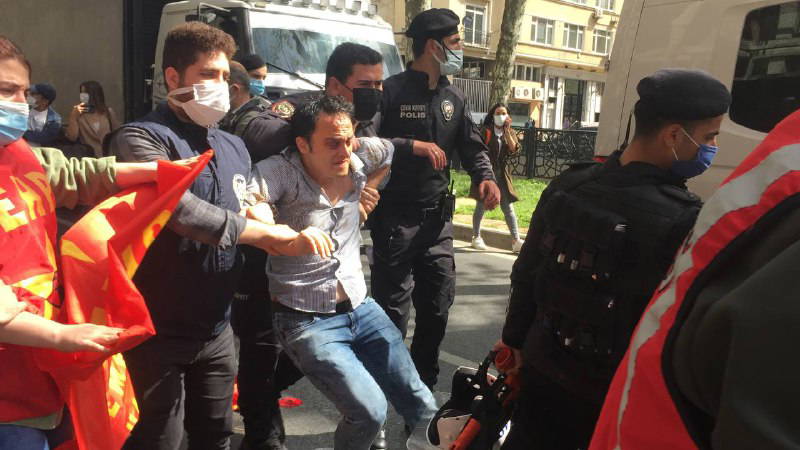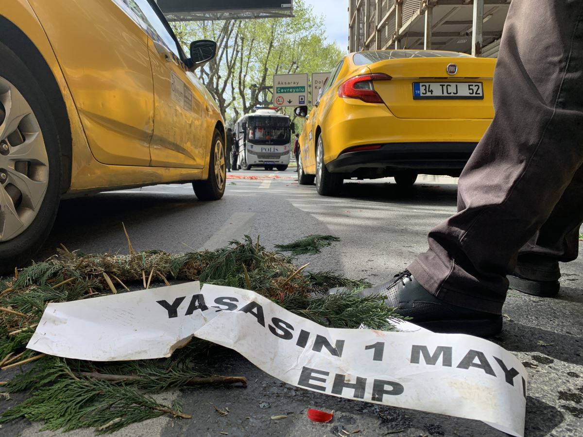 EHP üyeleri 1 Mayıs 1977’de yaşamını yitirenler için Taksim’e “Yaşasın 1 Mayıs” yazan çelenk bırakacaktı. Polis EHP’lilerin gözlerine doğru biber gazı sıktı ve ardından gözaltına aldı. EHP üyeleri “Halkımızı öldüren sömürücü bu düzen”, “Aşı haktır patent hırsızlıktır” sloganlarıyla yürüdü. EHP Sözcüsü Özge Akman gözaltına alınırken “Ferman devletin 1 Mayıslar bizimdir.” dedi. Polisin gözaltına alırken “Yatır yere kelepçeyi bas” dediği duyuldu.