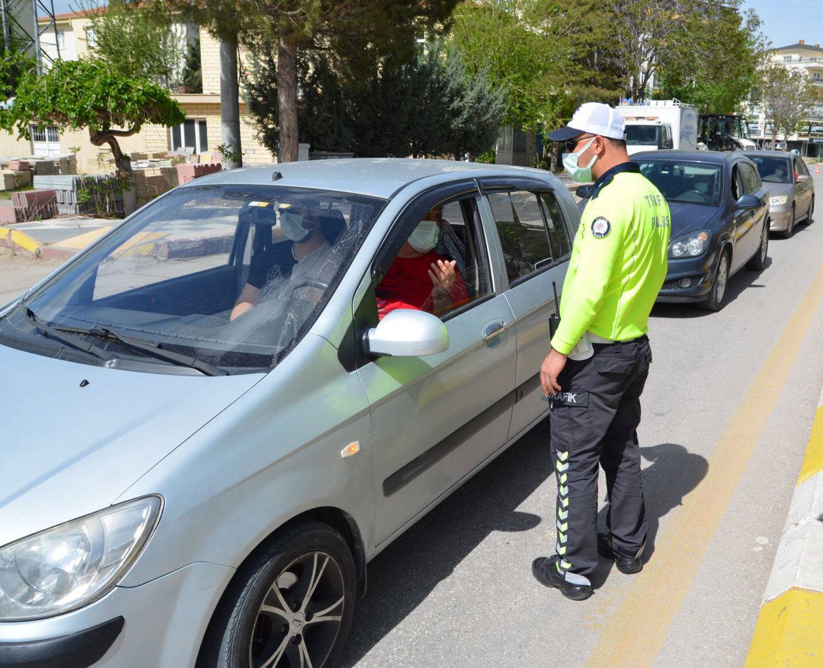 Cumhuriyet Bulvarındaki denetimlerde trafik polisleri, durdurulan araçlardaki kişilerin seyahat ve çalışma izin belgelerini kontrol etti.