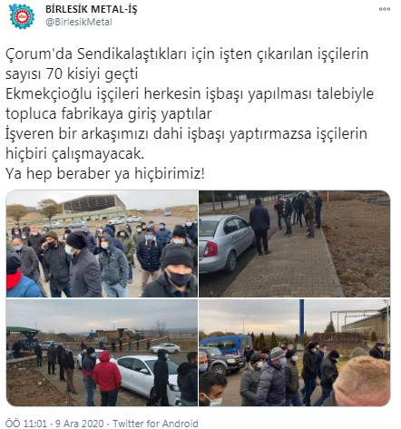 Çorum’da kurulu Ekmekçioğlu Metal Kimya Sanayi ve Ticaret A.Ş. işletmesinde, sendikalaşma hakkını kullanarak Birleşik Metal-İş'te (BMİS) örgütlenenen işçilere yönelik işçi kıyımı büyüdü.