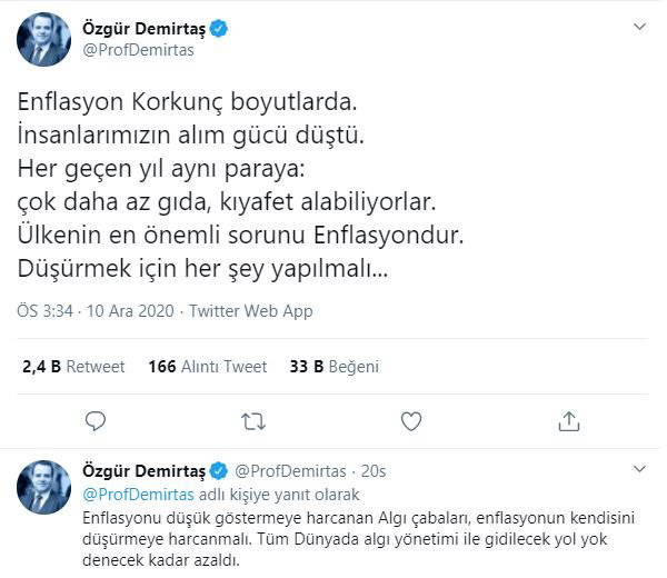 "Enflasyon korkunç boyutlarda. İnsanlarımızın alım gücü düştü. Her geçen yıl aynı paraya çok daha az gıda, kıyafet alabiliyorlar. Ülkenin en önemli sorunu enflasyondur. Düşürmek için her şey yapılmalı... Enflasyonu düşük göstermeye harcanan algı çabaları, enflasyonun kendisini düşürmeye harcanmalı. Tüm dünyada algı yönetimi ile gidilecek yol yok denecek kadar azaldı"