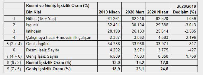 Tabloya bakacak olursak; Türkiye’de son bir ayda ve son bir yılda istihdam edilenlerin sayısı azalmış. Bu durumda normal olarak işsizlerin sayısı artacağı yerde o da azalmış. Bu tuhaf durumun nasıl ortaya çıktığının yanıtı tablonun 4 ve 7 numaralı satırlarında saklı. 4 numaralı satırda yer alanlar; son 4 hafta içinde hiçbir işte ücretli ya da ücretsiz çalışmadığı halde iş başvurusu yapmayanlarla mevsimlik çalışma, ev kadını olma, öğrencilik, gelir sahibi olma, emeklilik ve çalışamaz halde olma gibi nedenlerle iş aramayıp ancak işbaşı yapmaya hazır olduğunu belirtenleri ifade ediyor. 4,5 milyonu aşkın sayıdaki bu kişileri de işsiz sayısına ve işgücüne eklersek (ki işin doğrusu budur) işsizlerin sayısı 8,4 milyona ve geniş işsizlik oranı da yüzde 24,6’ya yükseliyor. İşte Türkiye’nin gerçeğe en yakın işsizlik oranı budur.