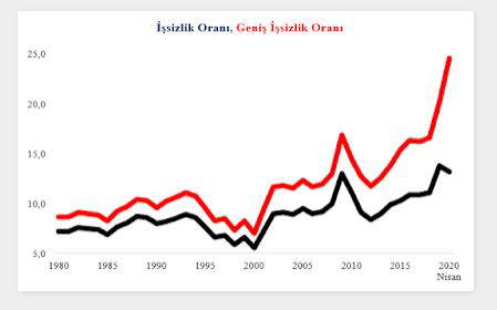 Her ne kadar kamuoyunda büyük kuşkular yaratsa da TÜİK’in esas aldığı resmi işsizlik oranı hesaplaması esas alınan varsayımlar altında doğru olabilir. Buradaki mesele esas alınan varsayımların Türkiye hesaplaması için gerçekleri yansıtmamasıdır. Çünkü gelişmiş ülkelerde işsizler sürekli başvuru yaptığı halde bizde bir süre sonra umudunu kesenler iş başvurusunda bulunmuyor ve işsiz sayılmaktan çıkıyor. O nedenle Türkiye’deki işsizliği en doğru gösteren oran yukarıda değindiğimiz son 4 ay içinde işi olmadığı ve işbaşı yapmaya hazır olduğu halde iş için başvurmayanların da dahil edildiği geniş işsizlik oranı olan yüzde 24,6’dır ve bu oran 2013 yılından beri sürekli artış eğilimindedir.