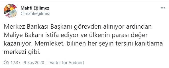 "Merkez Bankası Başkanı görevden alınıyor ardından Maliye Bakanı istifa ediyor ve ülkenin parası değer kazanıyor. Memleket, bilinen her şeyin tersini kanıtlama merkezi gibi"