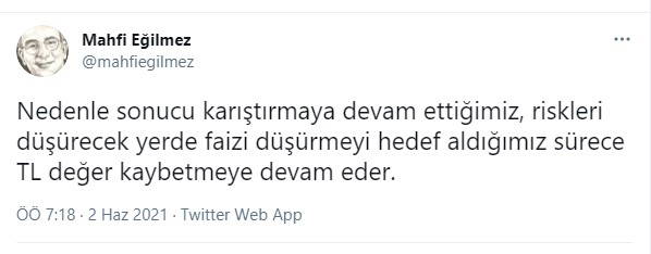 Sosyal medya hesabından Erdoğan'ın açıklamaları sonrası dolardaki yükselişe dikkat çeken ekonomist Mahfi Eğilmez, ''Nedenle sonucu karıştırmaya devam ettiğimiz, riskleri düşürecek yerde faizi düşürmeyi hedef aldığımız sürece TL değer kaybetmeye devam eder'' açıklamasını yaptı.
