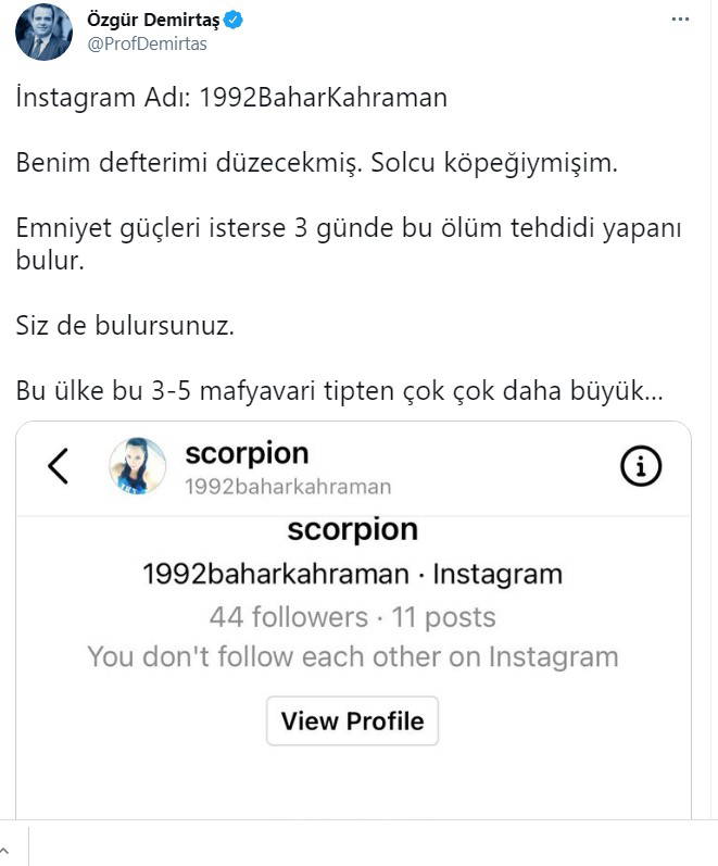 Twitter üzerinden paylaşım yapan Demirtaş, ''Instagram Adı: 1992 BaharKahraman. Benim defterimi düzecekmiş. Solcu köpeğiymişim. Emniyet güçleri isterse 3 günde bu ölüm tehdidi yapanı bulur. Siz de bulursunuz. Bu ülke bu 3-5 mafyavari tipten çok çok daha büyük'' ifadelerini kullandı.