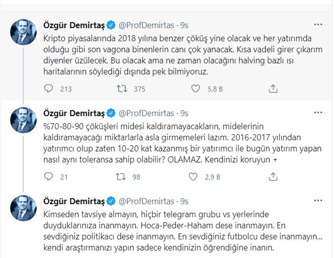 Sosyal medya hesabından 'kripto para' piyasasına ilişkin uyarılarda bulunan Sabancı Üniversitesi Finans Kürsü Başkanı Prof. Dr. Özgür Demirtaş, ''Kripto piyasalarında 2018 yılına benzer çöküş yine olacak ve her yatırımda olduğu gibi son vagona binenlerin canı çok yanacak. Kısa vadeli girer çıkarım diyenler üzülecek. Bu olacak ama ne zaman olacağını halving bazlı ısı haritalarının söylediği dışında pek bilmiyoruz'' ifadelerini kullandı.