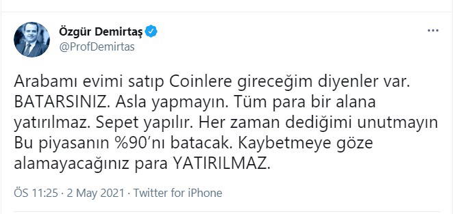 Demirtaş, ''Arabamı evimi satıp Coinlere gireceğim diyenler var. Batarsınız. Asla yapmayın. Tüm para bir alana yatırılmaz. Sepet yapılır. Her zaman dediğimi unutmayın Bu piyasanın yüzde 90’nı batacak. Kaybetmeye göze alamayacağınız para yatırılmaz'' diyerek uyarılarda bulundu.