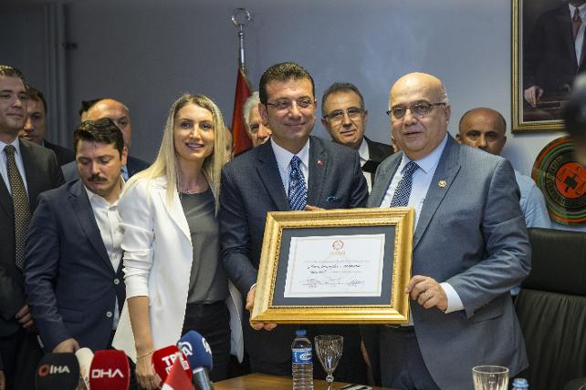 İmamoğlu, dün mazbatasını almak için saat 17.20 sıralarında eşi Dilek İmamoğlu, büyük oğlu Mehmet Selim İmamoğlu ve CHP İstanbul İl Başkanı Canan Kaftancıoğlu, İYİ Parti İstanbul İl Başkanı Buğra Kavuncu ile CHP’li milletvekilleri ve belediye başkanlarıyla İl Seçim Kurulu Başkanı Ziya Bülent Öner’in yanına çıktı. İmamoğlu da bir süre önce kalp krizi geçiren Öner’e geçmiş olsun dileklerini iletti. İmamoğlu, özetle “Çoğunluğu kadın olan bir heyetin imzasıyla görevi alıyorum. Bize verilen mesajı aldık. Bu bize kamu yönetiminde ya da yapacağımız görevlerde cinsiyet eşitliği adına, kadınların toplumdaki yeri adına değerli bir mesajdır. Bu mesajı İstanbul’un şehremini olarak taşımaktan onur duyacağımı, bu konuda gerekeni yapacağımı ilk mesajım olarak paylaşmak isterim” ifadelerini kullandı. İmamoğlu, Twitter hesabından mazbatalı fotoğrafını paylaşarak “Hak yerini buldu, 16 milyon İstanbullu adına mazbatamızı aldık” dedi.