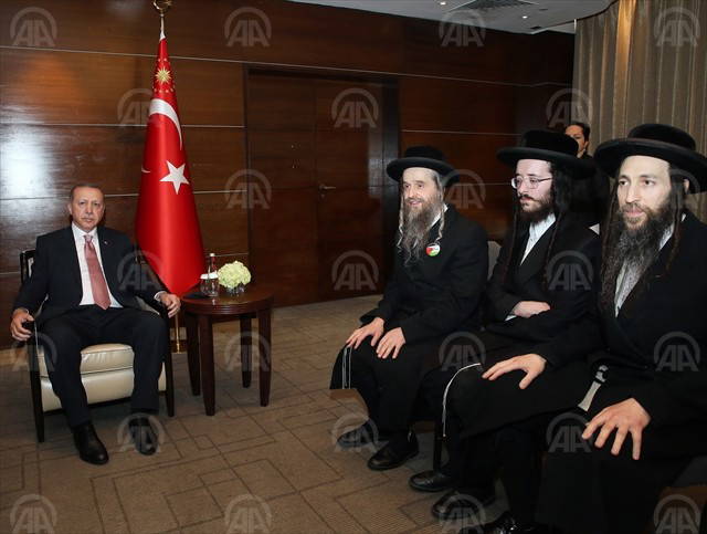 AA foto muhabiri Cem Öksüz tarafından 15 Mayıs 2018 tarihinde çekilen fotoğraf, Erdoğan’ın Neturei Karta Ortodoks Musevi Cemaati üyeleri ile İngiltere’de yaptığı görüşmeyi gösteriyor.