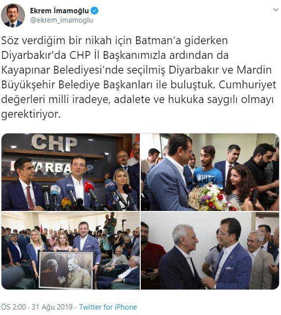 İmamoğlu, sosyal medya hesabından yaptığı açıklamada "Söz verdiğim bir nikah için Batman'a giderken Diyarbakır'da CHP İl Başkanımızla ardından da Kayapınar Belediyesi'nde seçilmiş Diyarbakır ve Mardin Büyükşehir Belediye Başkanları ile buluştuk. Cumhuriyet değerleri milli iradeye, adalete ve hukuka saygılı olmayı gerektiriyor." dedi.