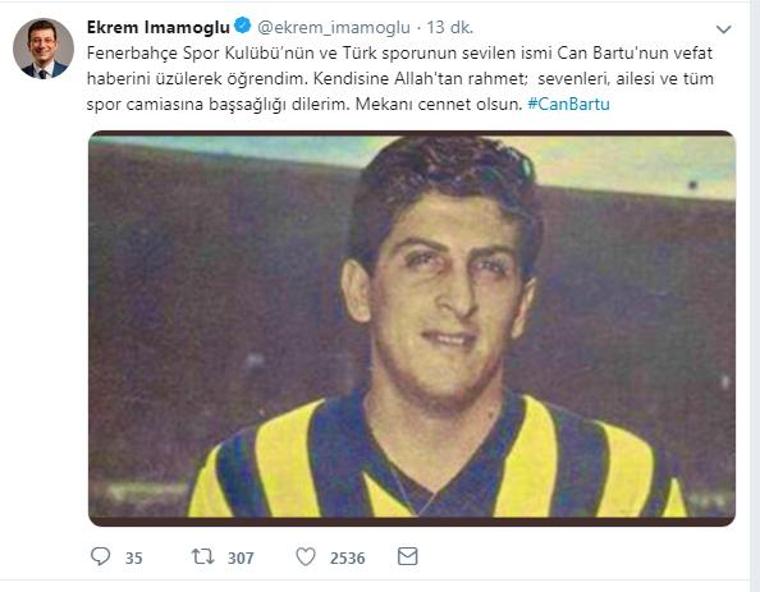 CHP'li İstanbul Büyükşehir Belediye Başkanı Ekrem İmamoğlu, Twitter'dan paylaştığı mesajda, "Fenerbahçe Spor Kulübü’nün ve Türk sporunun sevilen ismi Can Bartu'nun vefat haberini üzülerek öğrendim. Kendisine Allah'tan rahmet; sevenleri, ailesi ve tüm spor camiasına başsağlığı dilerim. Mekanı cennet olsun. #CanBartu" dedi.