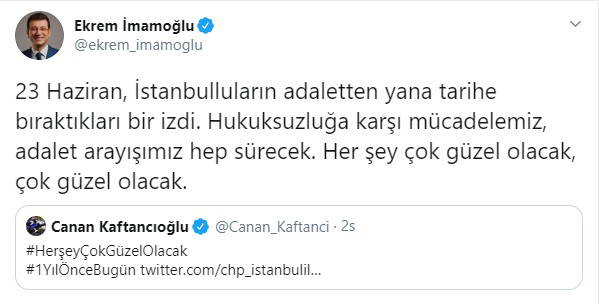 "23 Haziran, İstanbulluların adaletten yana tarihe bıraktıkları bir izdi. Hukuksuzluğa karşı mücadelemiz, adalet arayışımız hep sürecek. Her şey çok güzel olacak, çok güzel olacak"