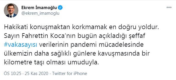 "Hakikati konuşmaktan korkmamak en doğru yoldur. Sayın Fahrettin Koca’nın bugün açıkladığı şeffaf #vakasayısı verilerinin pandemi mücadelesinde ülkemizin daha sağlıklı günlere kavuşmasında bir kilometre taşı olması umuduyla."