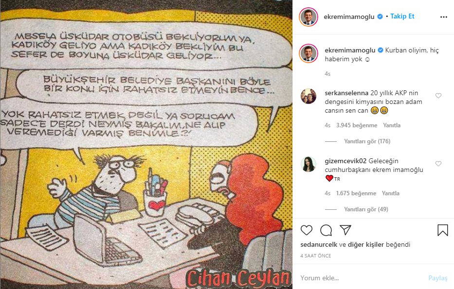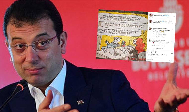 "Mesela Üsküdar otobüsü bekliyorum ya Kadiköy geliyor ama Kadıköy bekleyeyim bu sefer de boyuna Üsküdar geliyor. Sorucam sadece derdi neymiş bakalım, ne alıp veremediği varmış benimle" ifadeleri kullanılan karikatürü İmamoğlu "Kurban oliyim, hiç haberim yok" yanıtlı notuyla paylaştı.