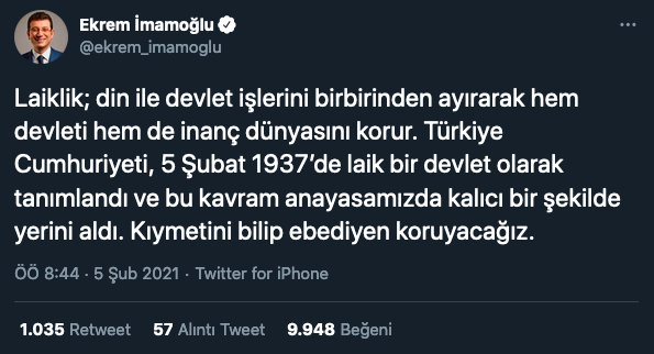 Laiklik; din ile devlet işlerini birbirinden ayırarak hem devleti hem de inanç dünyasını korur. Türkiye Cumhuriyeti, 5 Şubat 1937’de laik bir devlet olarak tanımlandı ve bu kavram anayasamızda kalıcı bir şekilde yerini aldı. Kıymetini bilip ebediyen koruyacağız.