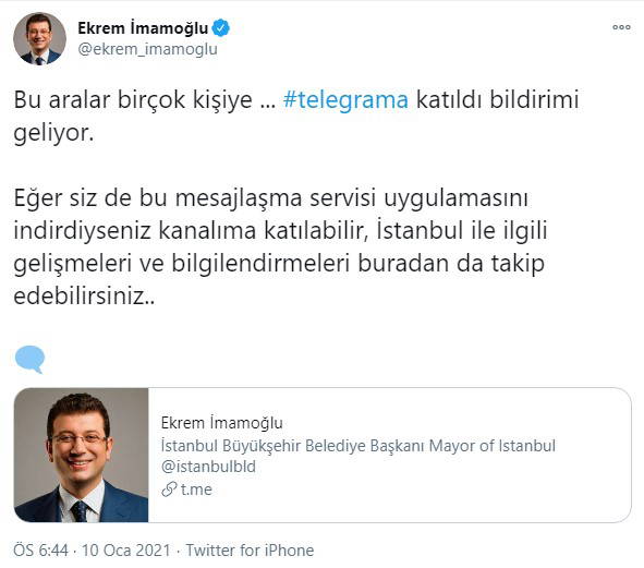 Facebook ve bağlı kuruluşlarının telefon numaraları ve konumları da dahil olmak üzere kullanıcı verilerini toplamasına izin vermelerini istemesinin ardından kitleler halinde Telegram'a geçen sosyal medya kullanıcılarının arasına İBB Başkanı Ekrem İmamoğlu da eklendi.