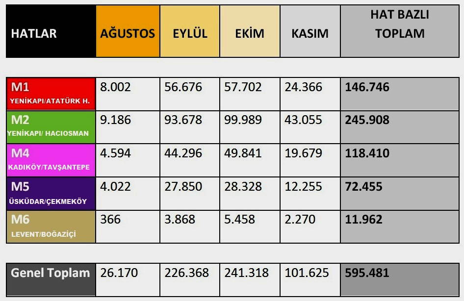 İBB'den alınan, cumayı cumartesiye ve cumartesiyi pazara bağlayan geceler ile bayram geceleri çalıştırılan metroların ekim ayına ait, çift biletli yolculuk verileri şöyle: 'Ekim ayında Yenikapı-Hacıosman metrosunda geceleri 99 bin 989 kişi yolculuk etti. 29 Ekim Cumhuriyet Bayramı ile birlikte toplam 9 geceyi kapsayan verinin günlük ortalaması 11 bin 110 yolcu, saatlik ortalama ise 1852. Metro A.Ş.'nin 2018 yılı verilerine göre aynı metro gündüzleri saatte 21 bin 580 kişi taşıyor. Diğer 4 metro hattında da durum aynı oranlarda.'