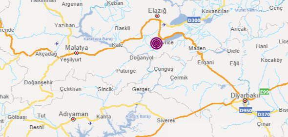 Elazığ'ın Sivrice ilçesinde 6,8 büyüklüğünde deprem meydana geldi. Afet ve Acil Durum Yönetimi Başkanlığı'nın (AFAD) Twitter hesabından yapılan bilgilendirmede, Sivrice ilçesinde saat 20.55'te 6,8 büyüklüğünde deprem kaydedildiği ifade edildi. Deprem, yerin 6,75 kilometre derinliğinde gerçekleşti. Elazığ Sivrice merkezli deprem, Gaziantep, Şanlıurfa, Malatya, Tunceli, Samsun, Tokat, Çorum, Sivas, Niğde, Kayseri Kırşehir, Trabzon, Ordu ve Giresun'da da hissedildi.
