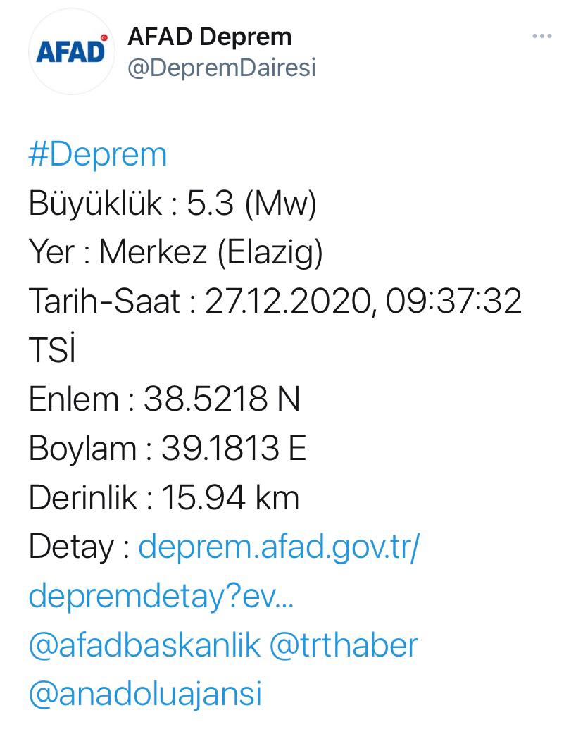 AFAD, saat 09.37'de merkez üssü Elazığ olan 5,3 büyüklüğünde deprem meydana geldiğini açıkladı. Deprem Malatya ve Diyarbakır'da da hissedildi. Dün, Elazığ'ın Sivrice ilçesinde saat 14.09'da 4,1 büyüklüğünde bir deprem daha meydana gelmişti. Elazığ merkezde yerin 6 kilometre derinliğinde 5,3 büyüklüğünde bir deprem meydana geldi.