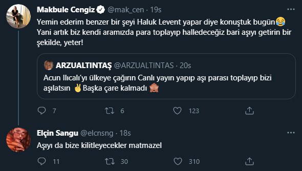 Sağlık Bakanı Fahrettin Koca'nın önceki akşam yaptığı aşı açıklaması sosyal medyada tartışılmaya devam ediliyor. Koca'nın açıklamalarının ardından bir Twitter kullanıcısının, "Acun Ilıcalı’yı ülkeye çağırın, canlı yayın yapıp aşı parası toplayıp bizi aşılatsın. Başka çare kalmadı" şeklindeki ironik paylaşımını alıntılayan gazeteci Maklube Cengiz, "Yemin ederim benzer bir şeyi Haluk Levent yapar diye konuştuk bugün. Yani artık biz kendi aramızda para toplayıp halledeceğiz bari aşıyı getirin bir şekilde, yeter!" diye yazdı.