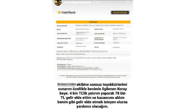 Son zamanlarda sahte Instagram destek hesabından kullanıcılara ‘topluluk kurallarının ihlali, telif hakları’ içerikli mesajlar atılmaya başladı. Mesajda yer alan linke tıklayanların sosyal medya hesapları ele geçirilerek, bir coin şirketine para yatırdıkları ve yatırdıkları paranın 4-5 katını kazandığını gösteren banka dekontunun paylaşımı yapılması üzerine gözler siber güvenlik uzmanlarına ve bankalara çevrildi. Sosyal medya hesapları çalınan kişilerin bir kısmından yüklü miktarda para çekilirken, şirket sahibi olduğu iddia edilen Koray adlı kişinin, kullanıcının takip ettiği kişilere de aynı şirkete yatırım yapmaları için mesaj attığı ve işlemlerle ilgili bilgi verdiği görüldü.
