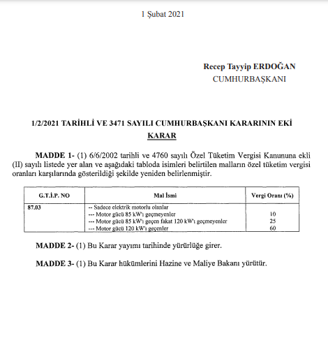 Elektrik motoru da olan araçlarda elektrik motor gücü 85 kW'ı geçmeyen araçların ÖTV matrah oranı %3'ten %10'a çıkarıldı. Motor gücü 85 kW'ı geçen fakat 120 kW'ı geçmeyen araçların ÖTV matrah oranı %7'den %25'e motor gücü 120 kW'ı geçen araçların ise ÖTV matrah oranı %15'ten %60'a yükseltildi.
