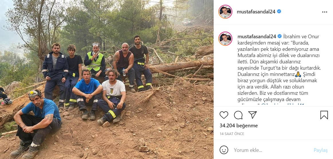 Instagram hesabından Çelikkol'un sahadaki ekiple çekilen fotoğraflarını paylaşan Mustafa Sandal, oyuncudan gelen mesaja da yer verdi. Paylaşımına "İbrahim ve Onur kardeşimden mesaj var" diyerek başlayan Sandal, "Burada, yazılanları pek takip edemiyoruz ama Mustafa ağebeyimiz iyi dilek ve dualarınızı iletti. Dün akşamki dualarınız sayesinde Turgut'ta bir dağı kurtardık. Dualarınız için minnettarız. Şimdi biraz yorgun düştük ve soluklanmak için ara verdik. Allah razı olsun sizlerden. Biz ve dostlarımız tüm gücümüzle çalışmaya devam ediyoruz" dedi.
