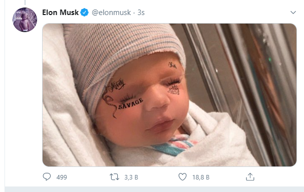 Bunun ardından bebeğin cinsiyetini soran bir takipçiye yanıt olarak erkek bebeği olduğunu yazan Musk, bebeğin adını soranlara da "“X Æ A-12 Musk" diye cevap verdi.
